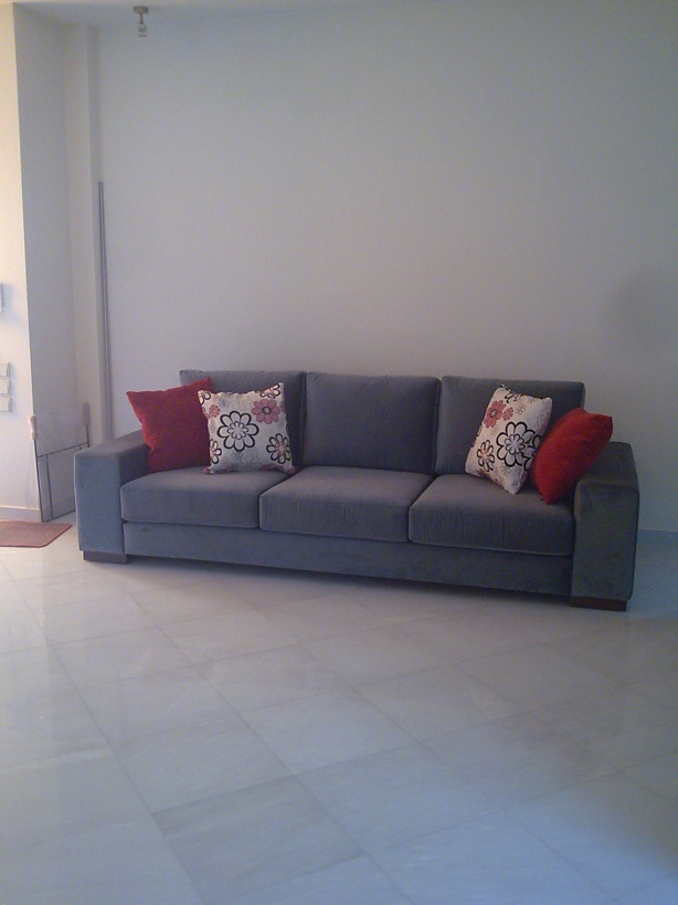 Τριθέσιος καναπές με τετράγωνα μπράτσα από ξύλο οξιάς. Διατίθεται και σε διθέσιο. Δυνατότητα επιλογής υφασμάτων.